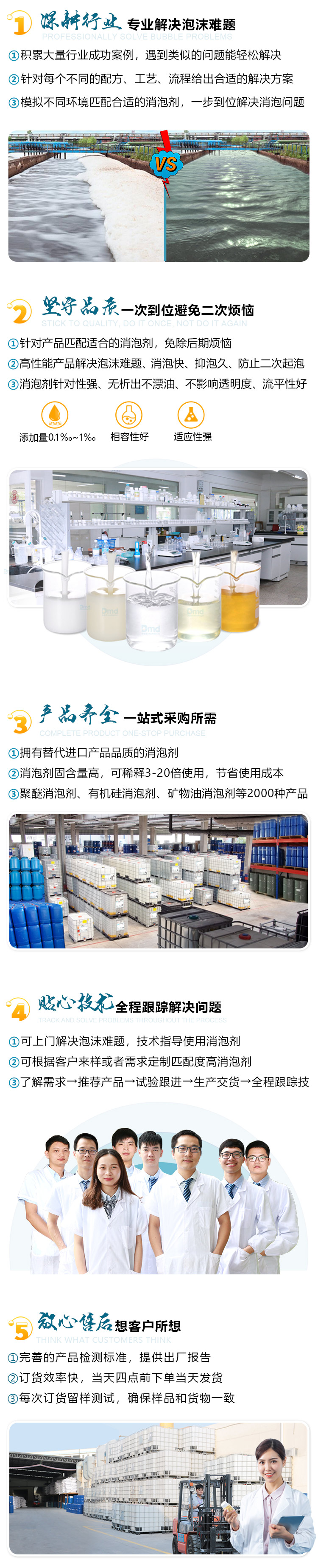 多年來公司面向市場,面向真實(shí)各行業(yè)客戶現(xiàn)場,對(duì)水處理消泡劑、工業(yè)消泡劑、有機(jī)硅消泡劑、發(fā)酵行業(yè)、清洗劑行業(yè)、金屬加工行業(yè)、造紙行業(yè)、建材行業(yè)、水性粘合劑行業(yè)、紡織印染行業(yè)、油田行業(yè)、水性涂料行業(yè)、印刷材料行業(yè)、電廠脫硫行業(yè)、工業(yè)清洗行業(yè)、家用化學(xué)品行業(yè)、采礦選礦工行業(yè)等32個(gè)行業(yè)工藝、流程及產(chǎn)品配方深入了解,對(duì)各行業(yè)消泡劑應(yīng)用了如指掌,給能客戶提供合適的解決方案,所研發(fā)生產(chǎn)消泡劑適應(yīng)客戶需求和市場需要,能輕松解決客戶遇到的難以解決的消泡難題,減少了客戶使用消泡劑的成本。公司依托完善的售前、售中及售后服務(wù),全程技術(shù)跟進(jìn)消泡劑的試樣到使用過程,節(jié)省了時(shí)間和成本,贏得了業(yè)界各類客戶們的贊譽(yù)!